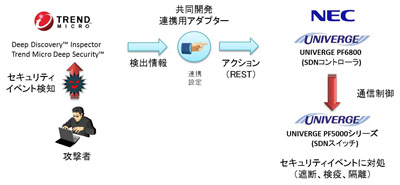 このソリューションは、NECのSDN対応製品「UNIVERGE PFシリーズ」と、トレンドマイクロのセキュリティ製品「Deep Discovery Inspector」「Trend Micro Deep Security」を連携させて実現するもの。標的型サイバー攻撃における不正通信やWebサイトの改ざんなどを検知した際に、瞬時に通信を遮断するほか、端末などの検疫・隔離を実施し、セキュリティリスクに自動対処できるようにする。