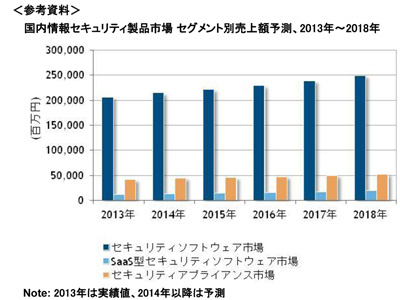 このうち国内セキュリティソフトウェア市場は、2014年はアイデンティティ/アクセス管理とエンドポイントセキュリティ、ネットワークセキュリティ、セキュリティ/脆弱性管理で需要が高まり、前年比4.1%増の2140億円と推定した。