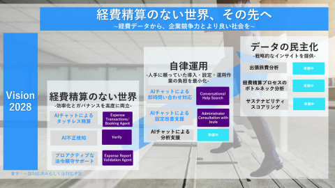 経費精算のない世界をより浸透させていくことは当然ですが、その一方で、コンカージャパンでは「Vision 2028」を打ち出し、「経費精算のない世界」の「その先」の姿として、「自律運用」や「データの民主化」といった世界を実現することを目指しています。ここでも、AIが重要な役割を果たすことになります。