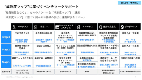 コンカーでは、経費精算をなくすためのノウハウを「成熟度マップ」に集約し、個々のお客さまの現状をとらえ、それをもとにコンサルティングを行ったり、課題解決をサポートしたりといった取り組みを行っています。すべてのユーザーのデータをもとに、いま、お客さまがどの位置にいるのかといったことを定量的に示し、ステージが上がらない原因を提示し、改善するための手だてやケーススタディも提示し、課題の解決までをサポートします。