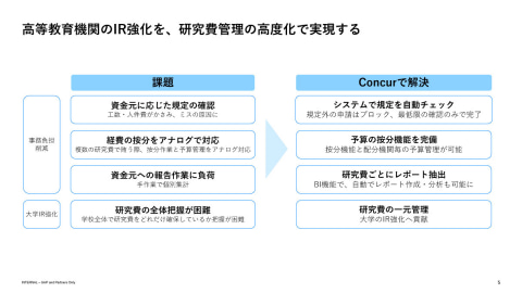 また2025年には、2つの国立大学にコンカーが導入されました。大学ではIR強化が課題となっており、なかでも研究費管理の可視化が重要な課題となっています。しかし、研究費には複数の資金元があり、管理が煩雑であるにもかかわらず、ほぼ手作業で行われており、研究費ごとに設けられた規定の確認や管理、資金元への報告などの作業に、工数や人件費がかさみ、ミスが発生しやすい状況も生まれています。