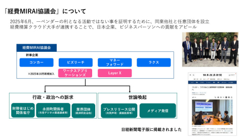 発足時から参画しているビズリーチ、マネーフォワード、ラクスに加えて、2025年12月には、LayerXおよびワークスアプリケーションズが参加したことで、経費精算に関するクラウドサービスを提供する企業という点から見ると、シェア100%に近い企業が参画する団体となりました。2025年9月には、新経済連盟と日本商工会議所の「税制改正提言」の中に、経費MIRAI協議会の要望である「会社決済型コーポレートカードによる旅費支払いを、出張旅費等特例の対象に含めるべき」という内容が反映されました。