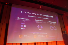 「一貫性」によって、どこでも共通のテクノロジーを採用して共通の運用やアプリケーションの可搬性を実現する。また「イノベーション」としては、ほかの会社などが使っている最新のイノベーションを自分たちのプラットフォームに持ってこられることを、オープンな技術という共通言語で実現する。そして「コラボレーション」としては、社内でも社内の部署間でも、共通の技術をベースにしてシームレスにすることで、コラボレーションを進められる、という意味だ。