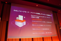 まずは、RHELの最新版である「RHEL 10」について。大きな特長に、特殊なコンテナを元にOSイメージをインストールする「イメージモード」がある。これにより、アプリケーションの投入スピードが向上し、運用を効率化し、不変のイメージでシステムのドリフト(管理された設定と実際の設定などのずれ)のリスクを軽減し、不変のシステムイメージでセキュリティを強化するという。