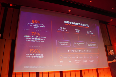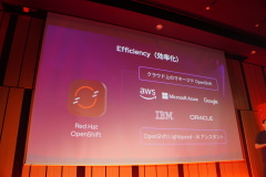 OpenShiftについては、コンテナと仮想化の両方を一貫して動かせるようになったことや、ソブリンクラウドのニーズにも対応すべく国内パートナーがOpenShiftを採用していること、OpenShiftの管理コンソールでAIアシスタントが使える「OpenShift Lightspeed」などについて駒澤氏は紹介した。