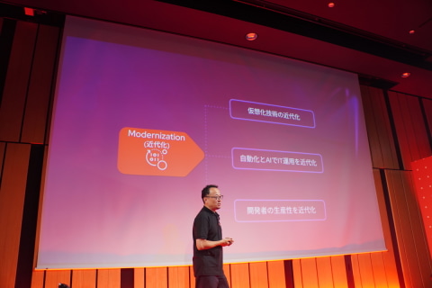 続いて「近代化」について。これをさらに、「仮想化技術の近代化」「自動化とAIでIT運用を近代化」「開発者の生産性を近代化」の3つに分けて駒澤氏は説明した。