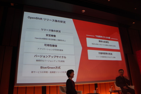 OpenShiftによる環境のリリース後について尋ねられると、満足していると早川氏は答えた。大きなトラブルが起きずに安定稼働しており、繁忙期にはPodをすぐに追加して可用性を確保できる。また、OpenShiftのバージョンアップサイクルの早さには当初驚いたが、2系統に分け、バージョンアップのテスト内容を明確に定めたことにより、計画的にバージョンアップできているという。さらに、アプリケーションのBlue/Green方式にも対応した。