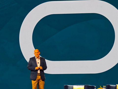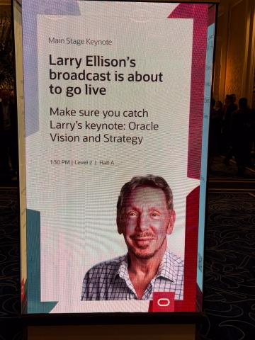 会期初日となった10月14日は、同社 会長兼CTO(最高技術責任者)のラリー・エリソン氏など同社幹部が登壇して、基調講演などが行われた。しかし、本来13時30分(現地時間)から行われる予定だったエリソン氏の基調講演は、直前になりライブ講演からライブ中継に変更され、さらに開始時間も1時間遅れるという前代未聞の状況で行われた。