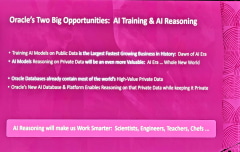 そうした混乱を乗り越えて始まったエリソン氏の講演だが、特になぜライブ中継になったのか、なぜ1時間遅れたのかなどの説明もなく、いきなり内容に入ったエリソン氏。エリソン氏は「今Oracleには、AIの学習と推論のそれぞれで大きな機会に恵まれている」と述べ、Oracleには、AIの大きなトレンドの中で、学習と推論の両面で多大なビジネスチャンスがあると語った。