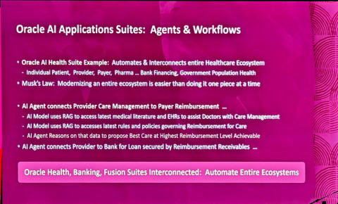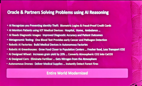 エリソン氏は、同社が推進しているAIスーパーコンピューターや今回Oracleが発表したOracle AI Database 26aiなどに関して言及し、強力なAI向けのハードウェアとOracle Databaseの組み合わせが、大企業がより強力なAIを導入するのに役立つとアピールした。