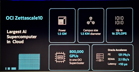 また、今回OCIは16Z(ゼタ)FLOPSという途方もない性能を持つ「Zettascale 10 SuperCluster」の計画を明らかにした。2026年の後半に導入される計画で、1.5ギガワットの消費電力で、16ZFLOPSという性能を実現する。