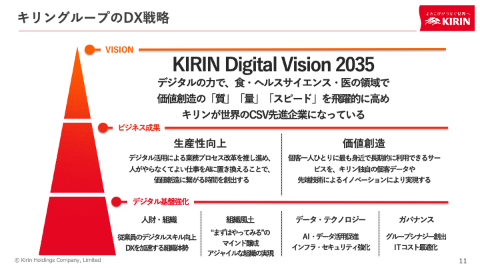 キリンの生成AI活用は、明確な戦略のもとに設計されている。2024年に策定したDX戦略長期ビジョン「KIRIN Digital Vision 2035」では、目指すビジネス成果として「生産性向上」と「価値創造」の2つを掲げた。