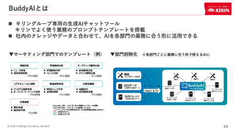 さらに、各部門が独自のデータやナレッジをBuddy AIに容易に組み込める仕組みも用意しており、キリン独自の知識を活用できるようにアップデートを重ねている。