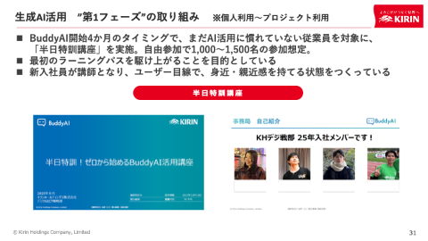 こうした目標を達成するため、キリンがグループ全体に展開したのが生成AIチャットツール「Buddy AI」だ。