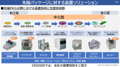 4つめの「次世代AI半導体製造設備技術」は、先端パッケージ分野における装置事業と生産技術によって構成するもので、回路形成から配線・電極形成、バンプ形成、ダイシング、クリーニング、ボンディングに至る「中工程」と呼ばれる領域において、インクジェット印刷機(開発中)、インプリント(開発中)、スパッタ、形状測定、プラズマダイサー、プラズマクリーナー、ボンダー(開発中)といった装置を、ワンストップソリューションとして提供できるという。CES 2026では、これらの装置技術を、モックアップと動画で紹介する展示内容としている。