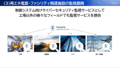 CES 2026で展示した「データセンター向けサイバーセキュリティ」は、全世界の自社工場300拠点のセキュリティ監視の実績をもとに、リスクアセスメントから監視、インシデント対応支援までを一気通貫で実施する「グループ工場監視による専門知識・監視体制」、電力制御に特化した独自開発の攻撃検知エンジンを追加搭載して、制御システム向けセキュリティ監視の検知能力をさらに強化した「電力制御に特化した攻撃検知エンジン」、制御システム向けサイバーセキュリティ監視サービスとして、工場以外のさまざまなフィールドでも監視サービスを提供する「再エネ電源・ファシリティ監視展開」が特徴だと説明した。自らが製造業であるパナソニックグループならではの専門性を生かし、Modbus、DNP3、SunSpecといったOTで活用される制御プロトコルを理解し、監視する強みも訴求している。データセンター向けサイバーセキュリティは、早ければ2026年度にも事業化する考えだ。