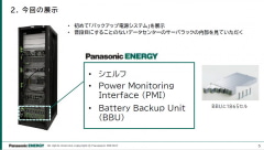 「データセンター向け蓄電システム」では、同社としては初めてバックアップ電源システムを展示。透明OLEDを搭載したデータサーバーのモックには、Battery Backup Unit(BBU)や、Power Monitoring Interface(PMI)が搭載され、サーバーラックの内部の様子を見ることができた。
