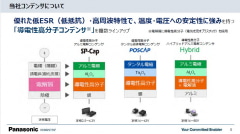 2つめの「生成AIサーバー向けデバイスおよびマテリアル」では、導電性高分子アルミ電解コンデンサの「SP-Cap」や、導電性高分子タンタル固体電解コンデンサ「POSCAP」、導電性高分子ハイブリッドアルミ電解コンデンサ、多層基板材料「MEGTRON」のほか、リレーやコネクタ、電気二重層キャパシタなどを展示した。