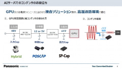 パナソニックインダストリーでは、「生成AIサーバーでは、大電流、高速化が進み、発熱による高温環境、部品点数の増大によるスペースの逼迫(ひっぱく)、高速化による伝送損失の影響拡大といった厳しい状況にあり、デバイスやマテリアルに対しても、過酷な使用環境への対応が求められている。パナソニックインダストリーでは、同様に使用環境が過酷な車載で培った圧倒的な商品力と、強固な顧客基盤による高精度な業界動向把握ができる点に強みがある」とし、「サーバーの電源回路基板に搭載するコンデンサにより、電圧の安定化やノイズ除去に貢献する一方、電子回路基板のもととなる高機能多層基板材料により、高速信号の損失を抑えることができる」と強みをアピールする。