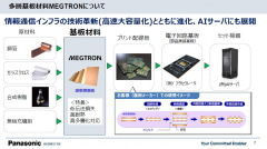 また、多層基板材料である「MEGTRON」は、業界最高レベルの低伝送損失と、高耐熱性、高多層化対応を実現しているのが特徴だ。MEGTRONは基板メーカーに供給され、プリント配線板に使用。その基板上に部品を実装し、AIサーバーなどに搭載されることになる。「電気信号が回路基板を通る際にエネルギーロスが発生するが、MEGTRONは、独自の樹脂設計技術と材料配合技術、ガラスクロスと銅箔(どうはく)との複合化技術によって、低伝送損失を実現し、AIサーバーの技術進化を支えられる」と述べた。