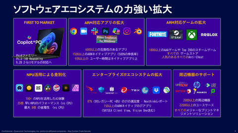また、ARMアーキテクチャであることによる互換性の懸念について尋ねられると、井田氏は、Snapdragon Xシリーズをリリースした時にさまざまな懸念の声が上がったと認めた。ただし現在では、グローバルで6000以上のアプリについて互換性が確認され、その中で1500以上がARMにネイティブ対応し、日本でもトップ350以上のアプリで100%の互換性を確認されているという数字を提示。「ほぼすべて問題ないかなと思っている」と回答した。ただし、企業固有などの特殊なアプリについては、一つひとつヒアリングして対応していると語った。
