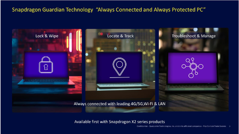 “エンタープライズ市場に向けて伝えたいこと”というお題に対しては、CESで発表されたSnapdragon X2シリーズにエンタープライズ向けとして追加された「Snapdragon Guardian Technology」を井田氏は紹介した。OSと独立してリモート管理できる機能で、社内のPCをまとめてドライバーをアップデートしたり、リモートワイプしたりすることが可能になる。