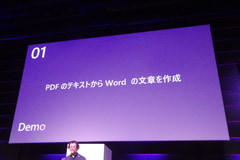 1つ目は、基調講演でもデモされた、PDFの文書からClick to Do(クリックして実行)でWord文書にする例だ。ちなみに、元の文書はコピーできない画像PDFとのこと。ここでのデモでは、Click to Doでメニューから選ぶかわりに「この内容を日本語で要約してください」と指示し、Microsoft 365のAI機能を呼び出す様子が披露された。