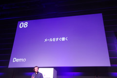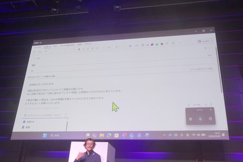 OutlookのAI機能を使い、比較的ラフな指示からメールの文面を書いてもらう例だ。デモでは、ローカルAIによる音声入力を使って指示が行われた。音声入力した言葉からAIが内容を理解し、句読点を自動的に入れる様子も披露された。
