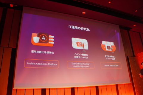 これによって、問題を自己修復する自律的なインフラ運用が実現することになる。「完全に自動になるのはまだ将来の話ですが、そのための基盤ができ始めているところです」とライト氏は語り、そのビルディングブロックの1つとして、アラートなどのイベントからAnsibleを実行する「Event-Driven Ansible」を挙げた。