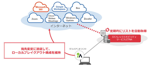 さらに、企業ネットワークを介さずに、拠点やリモートアクセス環境からSaaSに直接通信を行うローカルブレイクアウトにも対応するが、Microsoft 365やGoogle WorkspaceなどのSaaSは、IPアドレスやホスト名などの宛先情報が予告なく変更されるため、ネットワーク運用管理者は都度、最新の宛先情報を収集し、ネットワーク設定を変更する必要があるとのこと。