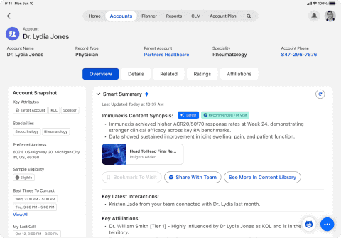 音声入力によるメモやコンプライアンスチェック、ポッドキャストのようなストーリー機能、簡潔なアカウントサマリーにより、外出中のMR、MSL、SRは、24時間365日いつでも重要な情報にアクセスでき、医療従事者が患者を最善の方法で治療できるよう支援する。