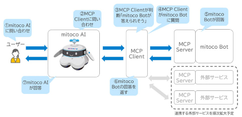 今回の新版では、新たに外部のMCPサーバーと接続できるようになった。これまでの「mitoco AI」は、Salesforce上のデータや事前に登録したRAG(検索拡張生成)ファイルなどの内部情報のみを参照していた。今回、MCPクライアントに対応することで、MCPサーバー経由で外部のサービスから直接データを取得可能になったため、回答の正確性向上や、外部アプリケーションとの連携による業務自動化など、活用の範囲を拡大できるという。今回は第1弾として、組織内の問い合わせを自動化するチャットボット「mitoco Bot」との連携に対応した。