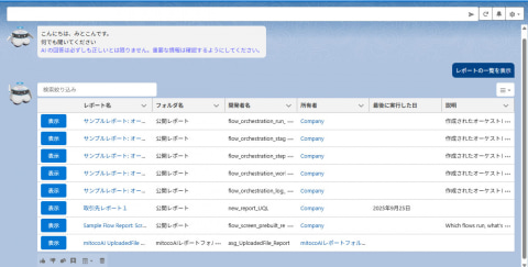 また、Salesforceのレポート連携機能が強化され、mitoco AIからSalesforceレポートの内容を直接参照できるようになった。これまではレポート名をリンクとして表示するのみだったが、新版では、データテーブルに「表示」ボタンが追加され、表形式レポートのデータをチャット画面上で確認できる。
