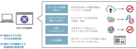 今回、同サービスに新たに追加された「ブラウジング保護(SecureLayer)」は、Webブラウザ経由で生じる多様なサイバー脅威から端末を保護する機能。業務で利用するブラウザ(Microsoft Edge、Chrome)に専用のプラグインを追加するだけで、さまざまなセキュリティ機能を利用できるという。
