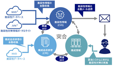 今回の「Senju Family 2025」では、まず、セキュリティ部門が管理するシステム脆弱性情報と、システム運用部門が管理する構成情報との自動突合機能を強化した。構成品目辞書(ハードウェアやソフトウェアを、統一された形式で識別するための名称をまとめた辞書)と構成情報をあらかじめ関連付けて、脆弱性情報と自動で突合する仕組みを搭載しており、管理対象システムの構成内にセキュリティ対策が必要な機器やソフトウェアが存在する場合、その管理担当者に自動で通知を送信できる。