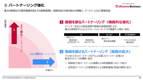 重点4領域の提供価値を上げるために、パートナーリングの強化も行う。価値を生み出せる企業との資本提携、戦略的業務提携を行うことで、ソリューションやサービスの価値向上を進めるという。また、価値を届けるパートナーリングとして、販路拡大の強化も図る考えで、「ドコモビジネスパートナープログラム」を通じた、パートナー企業との販売ネットワークの構築と強化を行うとした。