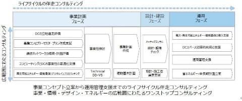 設計・建設フェーズでは、設計者または施工者の選定支援や、オーナーズコンサルとして要求性能と設計図書・施工図、施工状況の確認支援を提供する。運用フェーズでは、系統電力・再生可能エネルギー・環境価値の導入支援、データセンタースペースの効率的な利用の支援(データセンター事業者とエンドユーザーのハブ機能)、省エネ診断、中長期計画立案支援を含む運用管理支援、事業進捗評価・計画修正、顧客獲得・拡張戦略支援を提供する。
