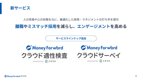 株式会社マネーフォワードは1日、従業員エンゲージメント領域の新サービス「マネーフォワード クラウド適性検査 powered by ミキワメ」、「マネーフォワード クラウドサーベイ powered by ミキワメ」の提供を開始すると発表した。