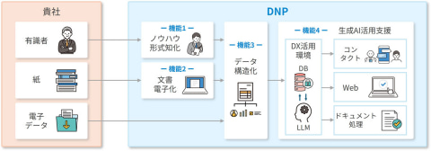 また、生成AIの活用により、蓄積した情報を誰もが共有・利用できる環境を提供する。具体的には、DNP独自のデータ構造化技術を用いて、属人化された情報や社内に分散して存在する情報を生成AIが認識しやすいデータ形式に整理しているため、生成AIの大規模言語モデル(LLM)や検索拡張生成(RAG)の技術を活用して、チャットボット等で効率的にノウハウの共有・活用を行えるとした。