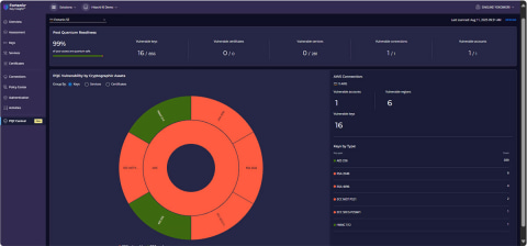 Amazon Web Services(AWS)やMicrosoft Azureなどのクラウドサービス上のシステムでは、Fortanixの「Key Insight」を活用。システム内で使用されている暗号鍵や証明書を自動的に検出し、それぞれの使用状況や有効期限、暗号方式の種類、量子コンピュータによる脆弱性の有無などを分析・可視化し、効率的な現状分析とリスクの可視化を実現するとした。