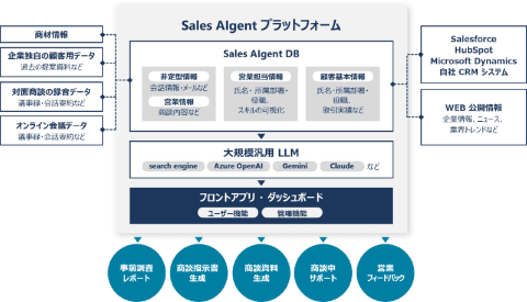 Sales AIgentは、営業先について公開されている情報と自社内に蓄積されている情報を参照し、商談準備から商談後までのすべての営業プロセスに伴走するAIソリューション。商談の質を上げることにフォーカスし、事前に顧客の基本情報レポートや商談指示書の自動生成、商談後のネクストアクションプラン提案など、営業案件の推進からクロージングに向けてAIが全方位的に営業活動を支援する。
