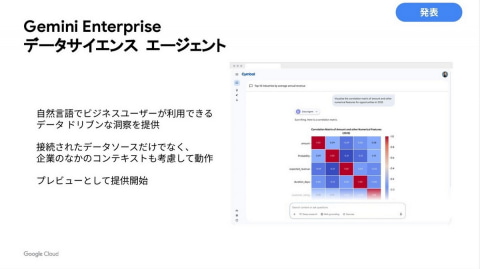 Gemini Enterpriseでは、データサイエンスエージェントもプレビューとして提供される。データサイエンスエージェントにより、ビジネスユーザーが自然言語でデータドリブンな洞察を呼び出すことが可能だ。接続されたデータソースだけでなく、企業内のコンテキストも踏まえて動作するという。