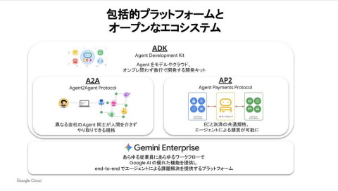 最後に寳野氏は、Googleのエージェントに対する考えがクローズドな環境に閉じるものではなく、オープンスタンダードであることを重視していると強調。Gemini EnterpriseもAgent2Agent Protocol(A2A)に対応しており、異なるエージェント同士が連携し、協調して動作することが可能だ。また、Agent Development Kit(ADK)を使って開発されたエージェントは、使用するAIモデルやクラウド環境に関係なく、Gemini Enterprise上で一元的に管理し運用できるとしている。