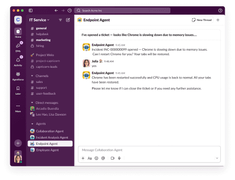 Agentforce IT Serviceは、SlackやMicrosoft Teams、従業員ポータル、Webチャットなど、従業員が普段働いている環境に対応し、Slackのメッセージ画面から直接リクエストを送るだけで、AIエージェントが質問対応やトラブル解決、緊急対応まで自動で行い、アプリを切り替えることなく即時サポートを実現する。