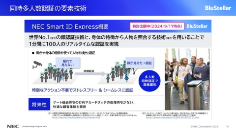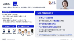 顔認証改札の実現に向けて、同社が取り組んでいるのが同時多人数認証の要素技術である。NEC Smart ID Expressでは、顔認証技術に、身体の特徴から人物を照合する技術を組み合わせることで、1分間に100人のリアルタイムな認証を実現。利用者は、特別なアクションをすることなく、ストレスフリーな認証を可能にしている。