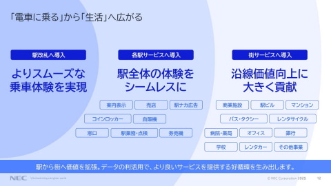 「電車に乗るから、生活へ広がる」においては、駅改札でのスムーズな乗車体験にとどまらず、案内表示や売店、広告、コインロッカー、自動販売機、窓口など、駅全体での体験に拡大。さらに、商業施設や駅ビル、バス・タクシー、レンタサイクル、レンタカー、マンション、病院・薬局、オフィス、銀行、学校など、街と連動したサービスへと拡張し、沿線価値の向上にも貢献できるという。