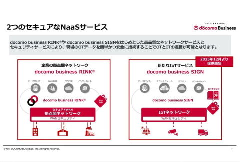 そこで今回両社が提供するのが、製造現場と外部ネットワークを連結した「セキュアデータ連携ソリューション」だ。オムロンが10月1日に発売した「データフローコントローラ」を活用し、製造現場のデータ収集や分析、可視化を簡素化するとともに、NTTドコモビジネスによるネットワーク組み込み型セキュリティを備えたNaaS(ネットワーク・アズ・ア・サービス)の「docomo business RINK WANセキュリティ」および「docomo business SIGN」を連携する。