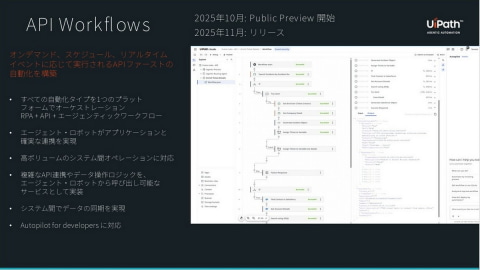 API Workflowsは、AIエージェントやRPAフローから呼び出すことも可能だ。これにより、各種自動化技術を組み合わせ、API中心の処理を柔軟に構築できる。UiPathの開発アシスタント「Autopilot for Developers」とも連携可能で、希望するワークフローの詳細を自然言語で記述するだけで、APIワークフローが設計できるとしている。