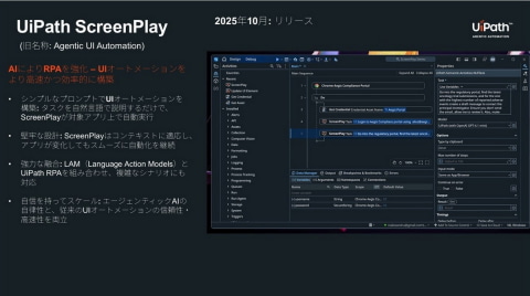 もうひとつの新機能であるUiPath ScreenPlayは、AIによってRPAを強化し、UIオートメーションをより高速かつ効率的に構築する機能。旧名称「Agentic UI Automation」として紹介されていたこの機能が、今月中に正式にリリースされる。