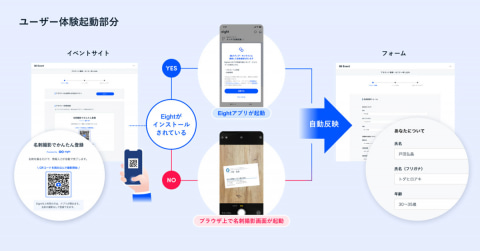 Eightユーザーの場合は、Eightアカウントを利用してログインすると、デジタル名刺の情報が申し込みフォームに自動で反映され、手入力の手間なく申し込みが完了する。一方、Eightを利用していない場合でも、手元の紙名刺をスマートフォンで撮影するだけで、名刺に記載されている氏名や所属、連絡先などの情報が正確にデータ化され、申し込みフォームに自動入力されるとのこと。